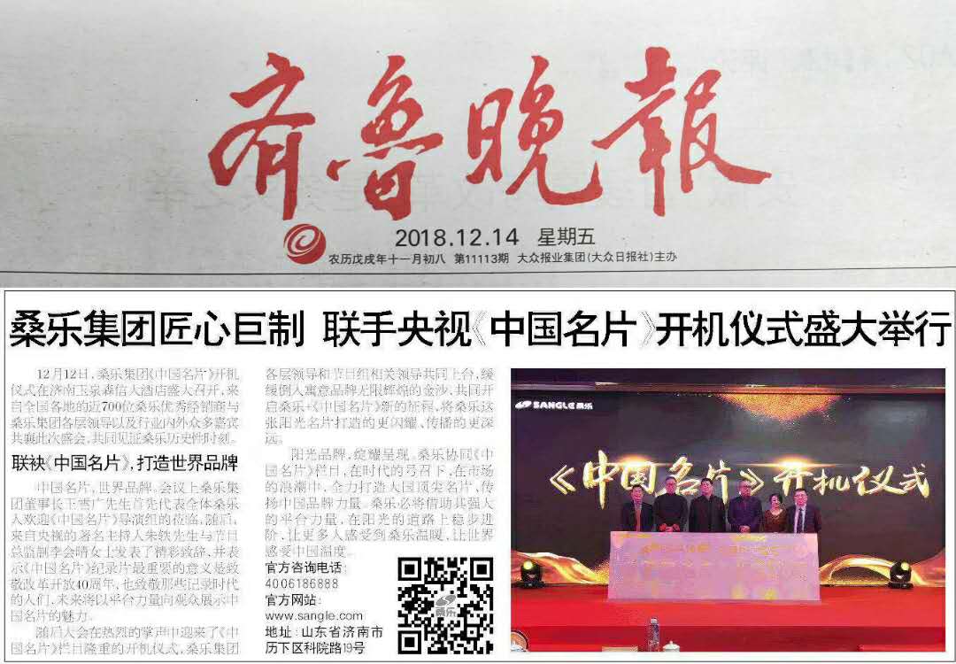 桑樂集團匠心巨制,聯(lián)手央視盛大舉行《中國名片》開機儀式。在時代的號召下、在市場的浪潮中,全力打造大國頂尖名片、傳揚中國品牌力量。桑樂必將借助其強大的平臺力量,在陽光的道路上穩(wěn)步進階,讓更多人感受到桑樂溫暖,讓世界感受中國溫度。今日《齊魯晚報》就這一盛況做了專訪,具體內(nèi)容如下: