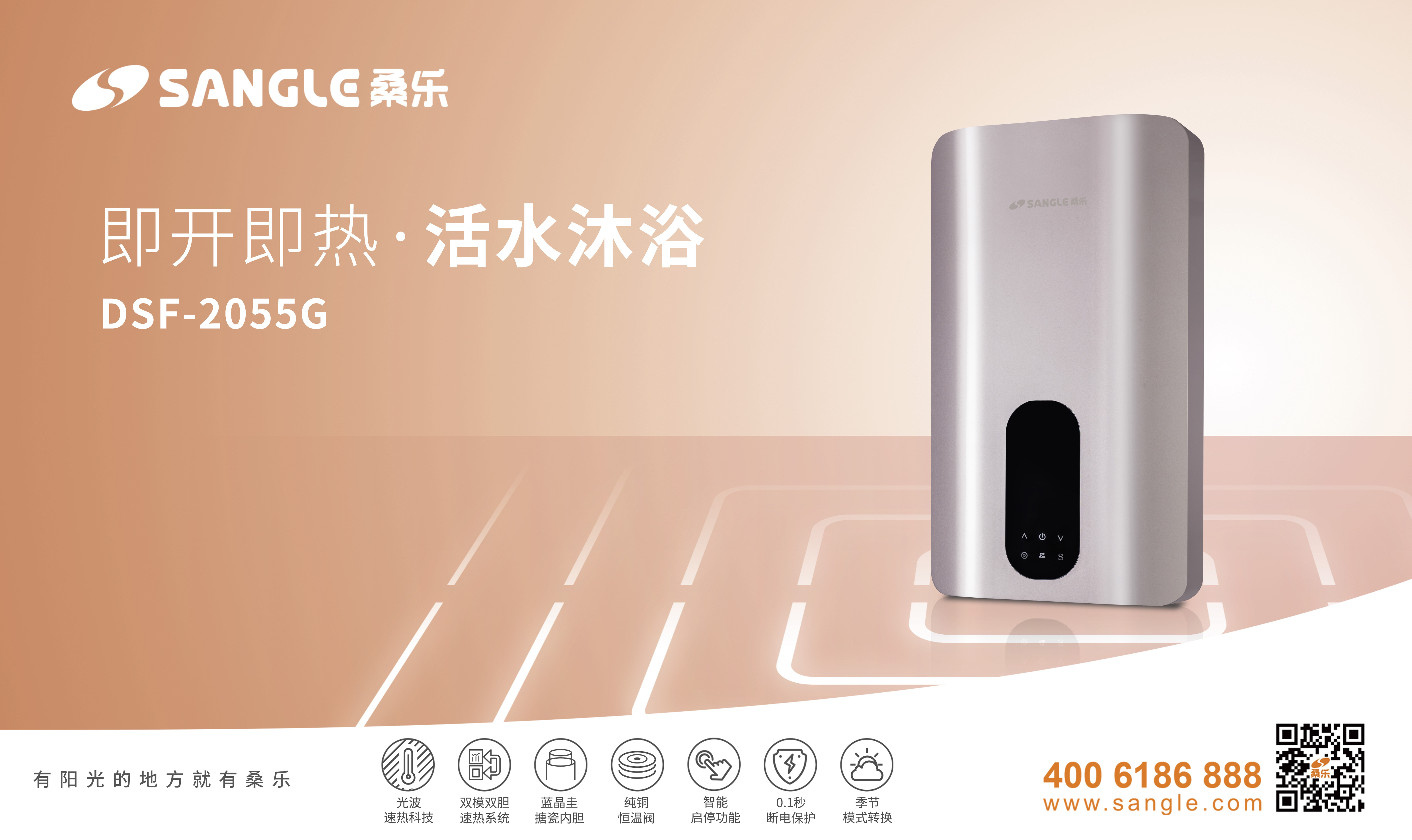 桑樂(lè)專(zhuān)注熱水領(lǐng)域32年,作為更健康的生活熱水專(zhuān)家自然會(huì)給你1+1>2的驚喜。或許每一次的技術(shù)革新無(wú)法像iPhone那樣顛覆整個(gè)智能手機(jī)時(shí)代,卻也想做一個(gè)專(zhuān)屬你的超級(jí)英雄,專(zhuān)注每一份體驗(yàn),守護(hù)每一份健康。桑樂(lè)DSF-2055G這款產(chǎn)品不僅將智能恒溫、調(diào)頻調(diào)溫等核心控制系統(tǒng)再次升級(jí),實(shí)現(xiàn)快速高效制熱,精準(zhǔn)恒溫,讓上班族的你在打開(kāi)熱水器的瞬間即被熱氣緊緊裹住,一整日的疲憊頃刻間消失殆盡,暢享舒適沐浴。同時(shí)它還采用了紅外線光波加熱技術(shù),將電、光、熱三步能量高效轉(zhuǎn)化,突破傳統(tǒng)熱水器加熱方式,隔水加熱,水電完全分離,不結(jié)水垢,整體壽命大大延長(zhǎng)至10000小時(shí)以上。除此之外光波速熱熱水器發(fā)射的紅外線還可以直接作用于氫鍵,可將大分子水轉(zhuǎn)化為對(duì)人體有益的小分子水,水質(zhì)也會(huì)變好,因此使用光波速熱熱水器沐浴,皮膚也會(huì)越洗越好,細(xì)微之處,盡顯周到。更值得一提的是其中的光波發(fā)熱體除了能發(fā)射紅外線,還有一支紫外光管,能夠?qū)⑺邪?xì)菌、病毒全部殺滅,360°呵護(hù)您和家人的健康。