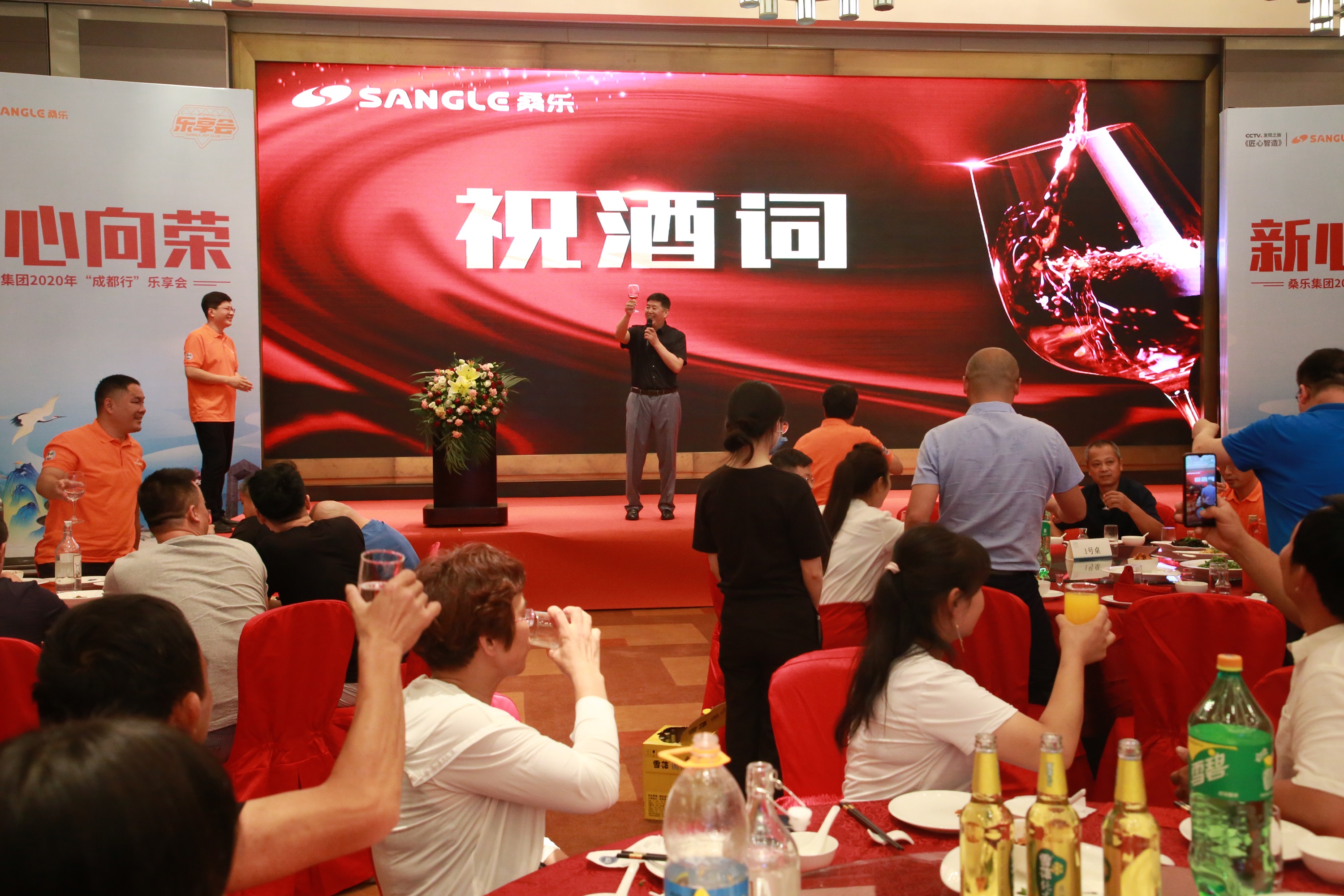 6月29日,為迎接來自各地經(jīng)銷商的到來,集團(tuán)精心準(zhǔn)備了一場盛大晚宴,大家在觥籌交錯(cuò),珍饈佳肴中,氤氳著久別重逢的喜慶氛圍。此外,現(xiàn)場還舉行了授旗儀式,董事長王雪廣親自授旗,經(jīng)銷商代表手握旗幟,在臺上揮旗飄揚(yáng),而這每一面旗幟都代表著桑樂不止所見的未來。